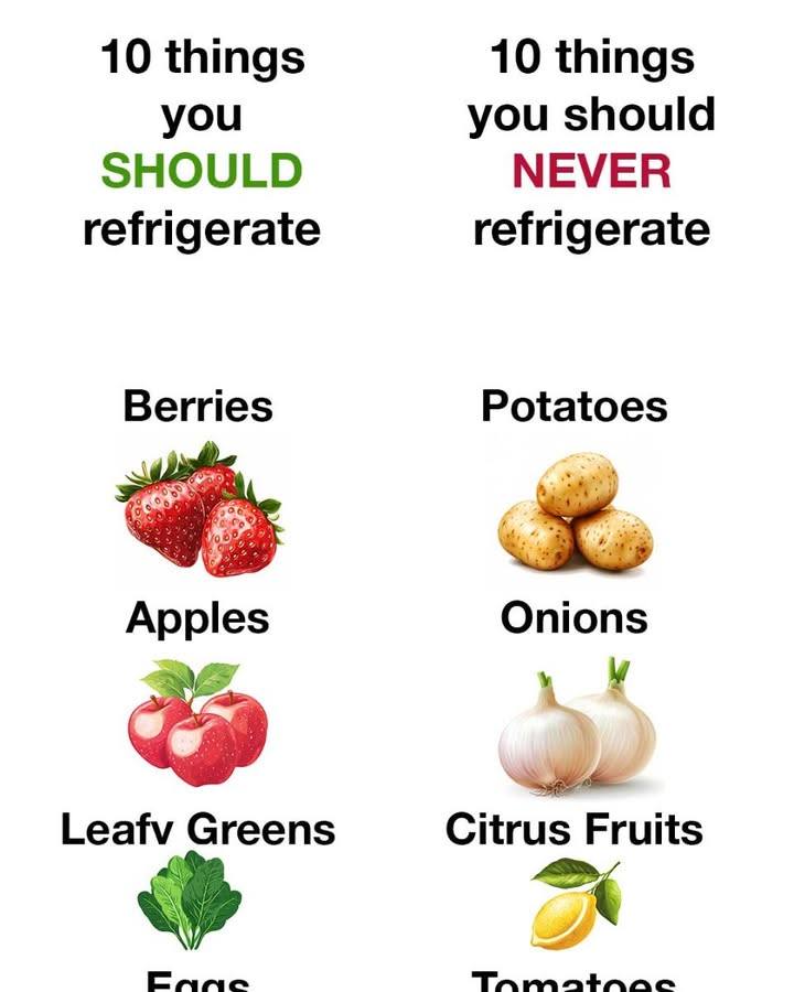 Here’s a practical guide to keeping your food fresh and tasty: what to always refrigerate and what to never refrigerate. 🥦🍞