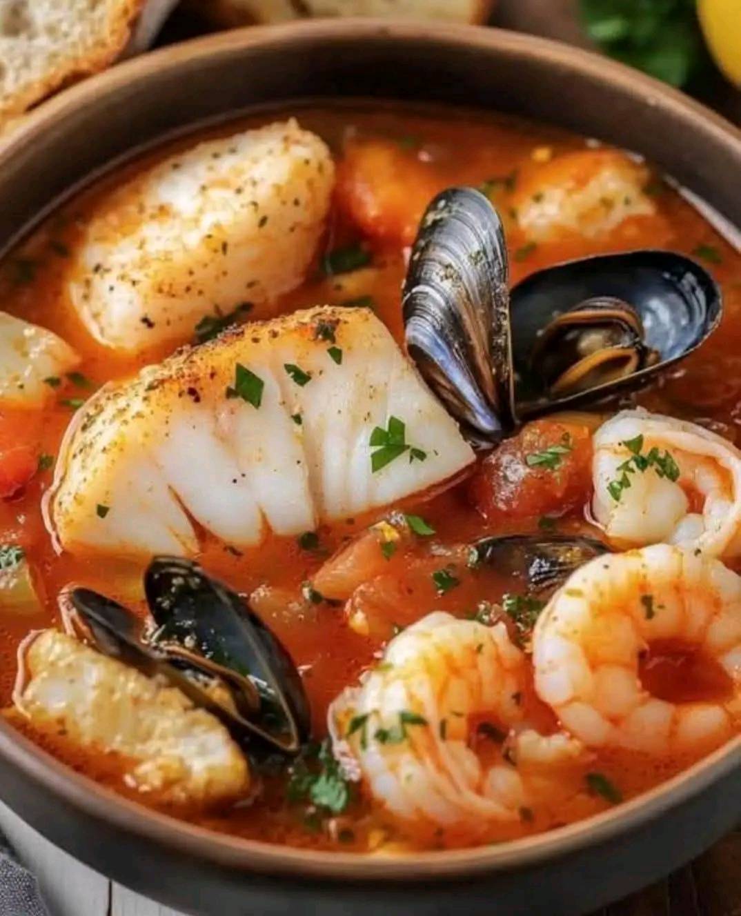 A traditional French seafood stew from Marseille, flavored with fennel, saffron, and herbs.