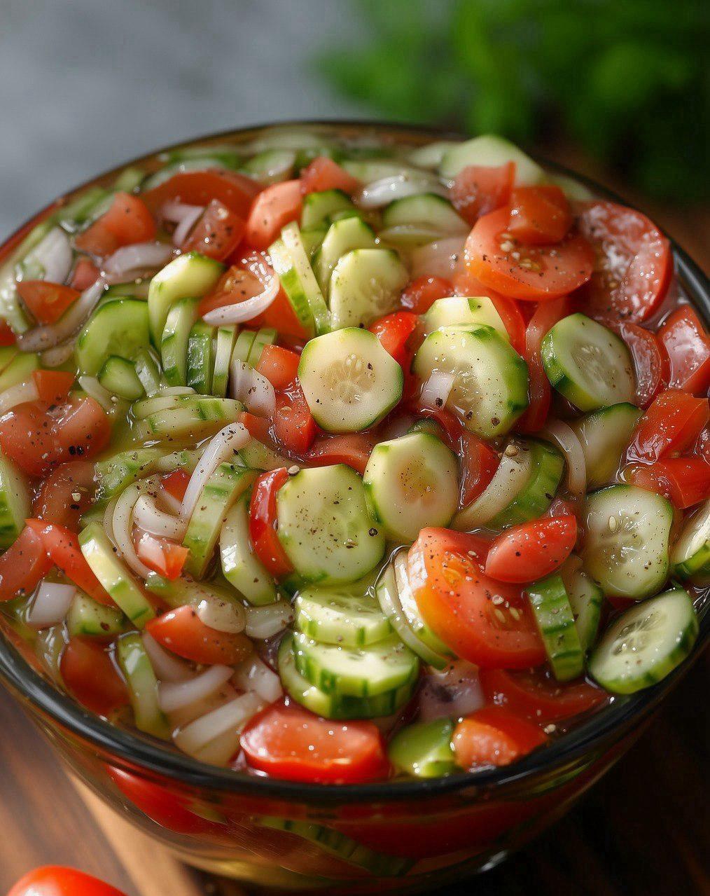 Thinly sliced cucumbers are tossed in a tangy-sweet dressing with onions and fresh herbs. Serve it chilled for a cool, crunchy contrast to grilled meats, spicy dishes, or summer meals.