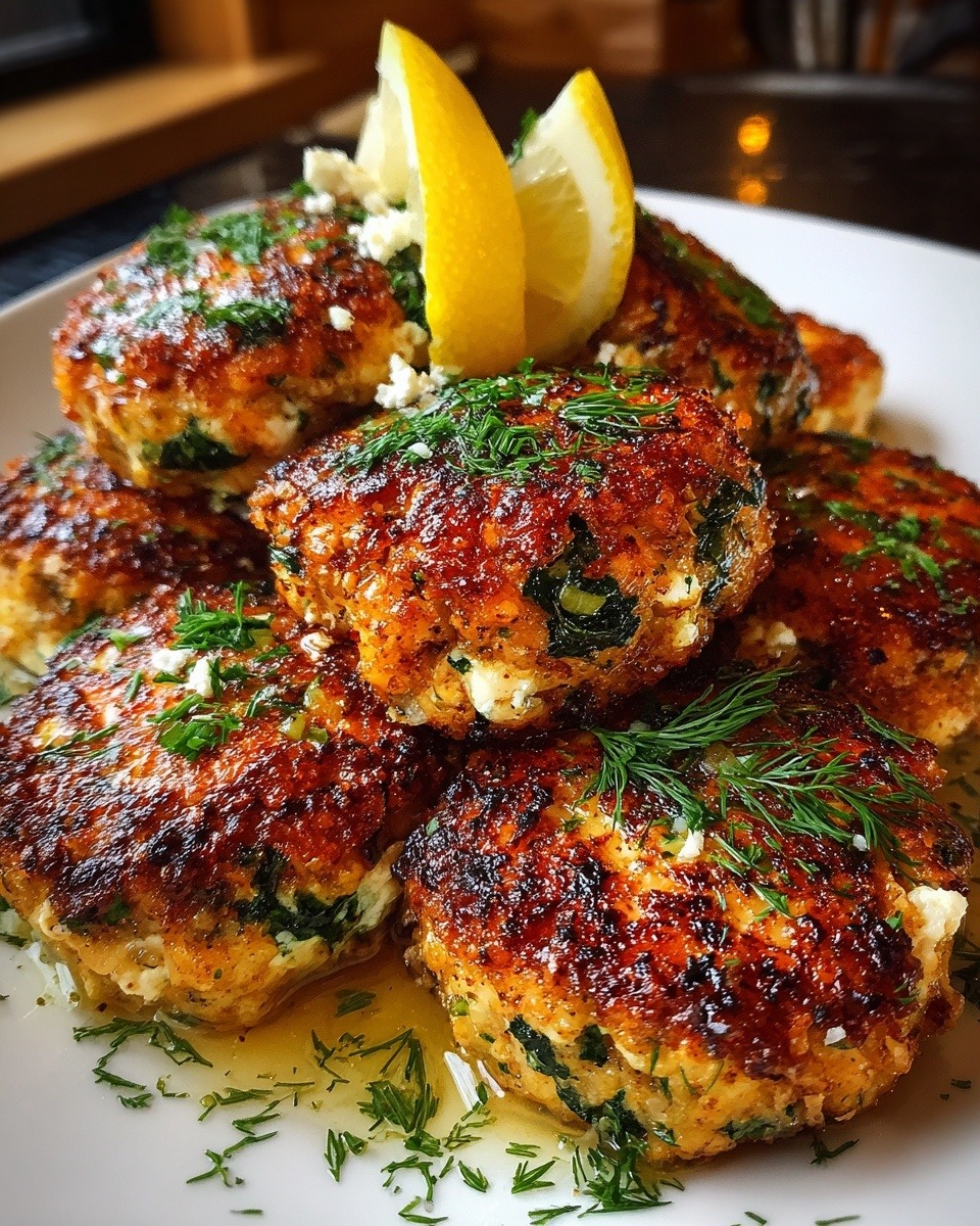π Golden-Crisped Salmon Cakes with Spinach, Feta & Fresh Herbs