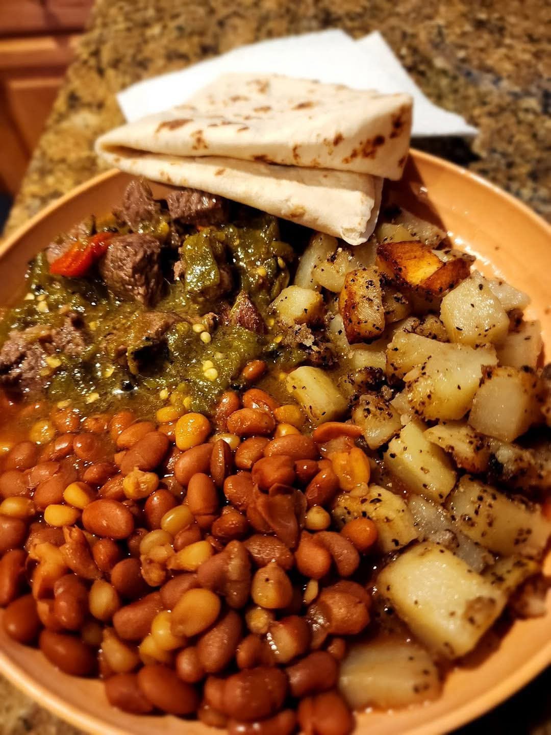 Green Chile, Papas & Beans with Chicos