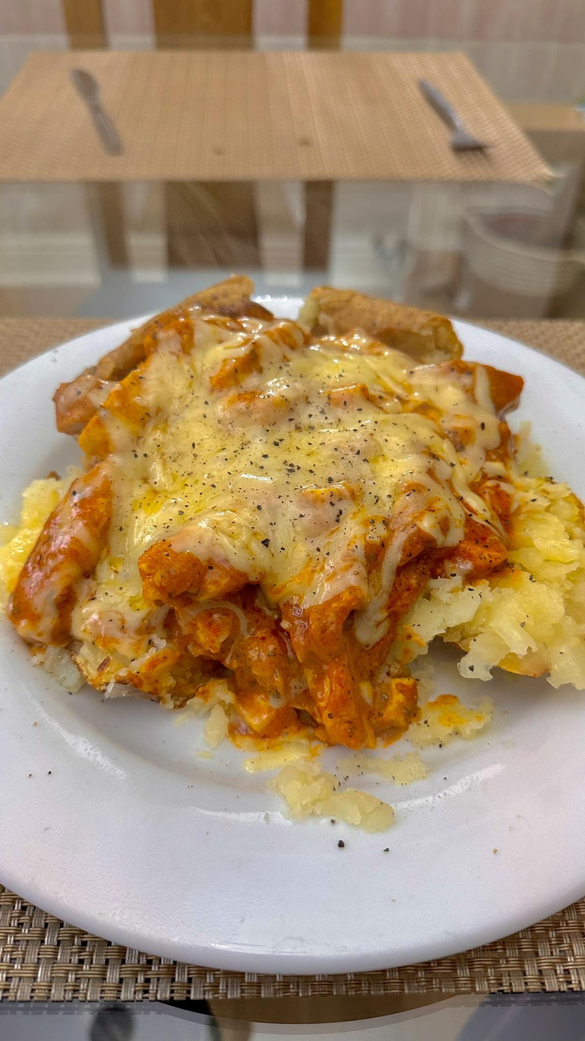 A crispy-skinned baked potato filled with tender chunks of chicken tikka masala, then topped with melty grated cheese. It’s hearty, comforting, and bursting with rich, creamy spice — a perfect meal-in-one.