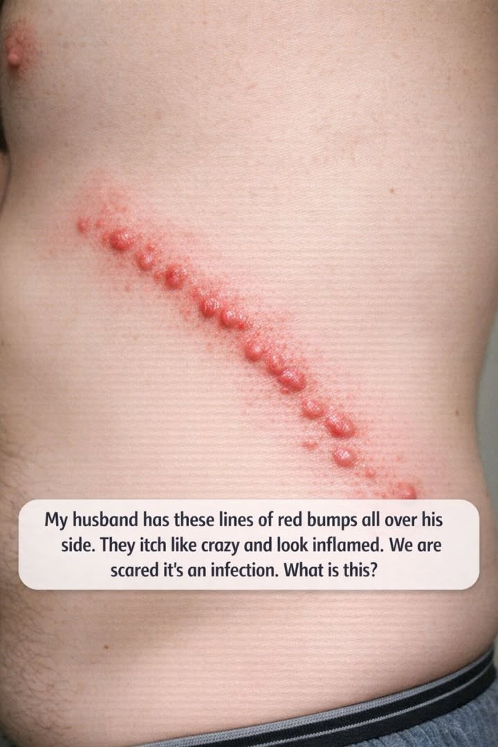I can’t diagnose from a description alone, but “lines of red, very itchy, inflamed bumps on one side of the body” strongly suggests a few common possibilities—one of them needs urgent attention.