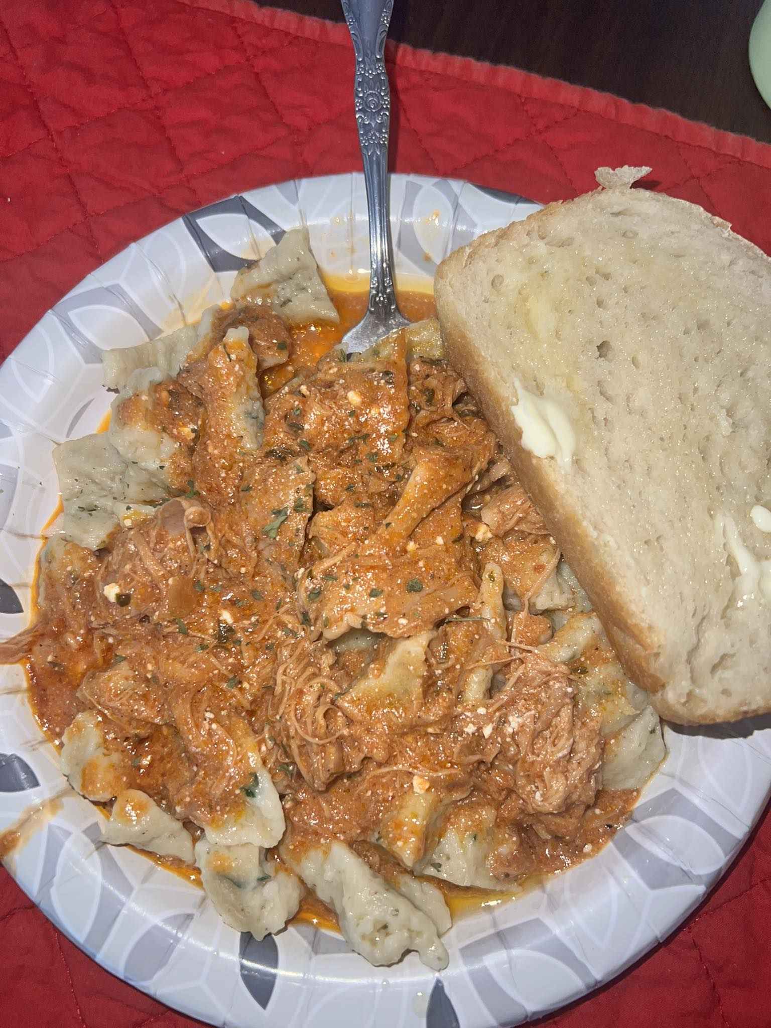 Here’s a comforting and hearty dish idea featuring pasta or dumplings with shredded meat in a rich tomato-based sauce — perfect for cozy evenings or make-ahead meals.