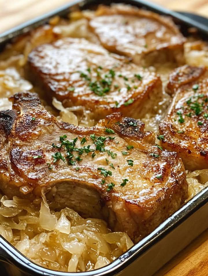 Perfect cozy comfort food choice! 🥩🥔 Pork Chop and Sauerkraut Casserole is a hearty, old-fashioned dish — tender pork chops baked with tangy sauerkraut, onions, and sometimes potatoes or apples for a touch of sweetness. It’s savory, simple, and deliciously nostalgic.