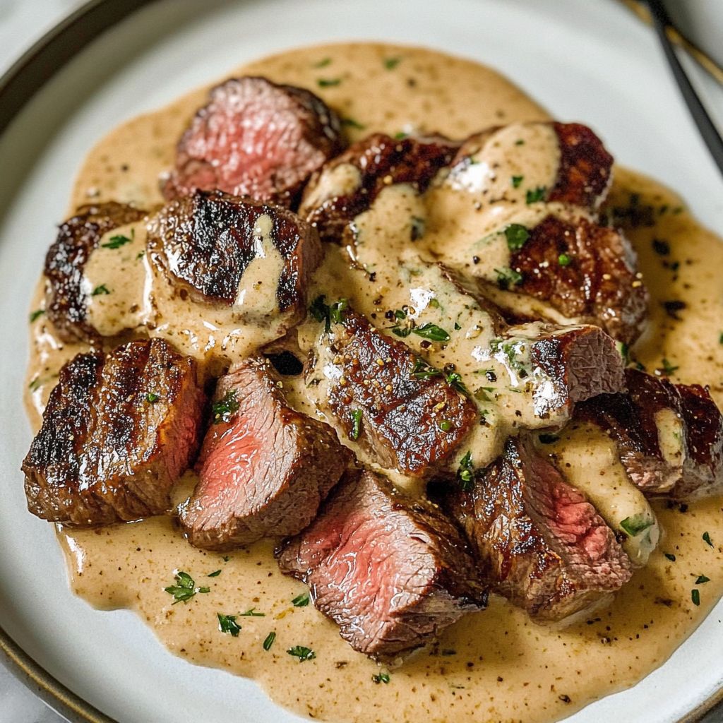 Perfectly seared steak served with a rich, velvety sauce made from garlic, cream, and a splash of bourbon — this dish balances deep, smoky flavor with a silky finish that complements any cut of beef.
