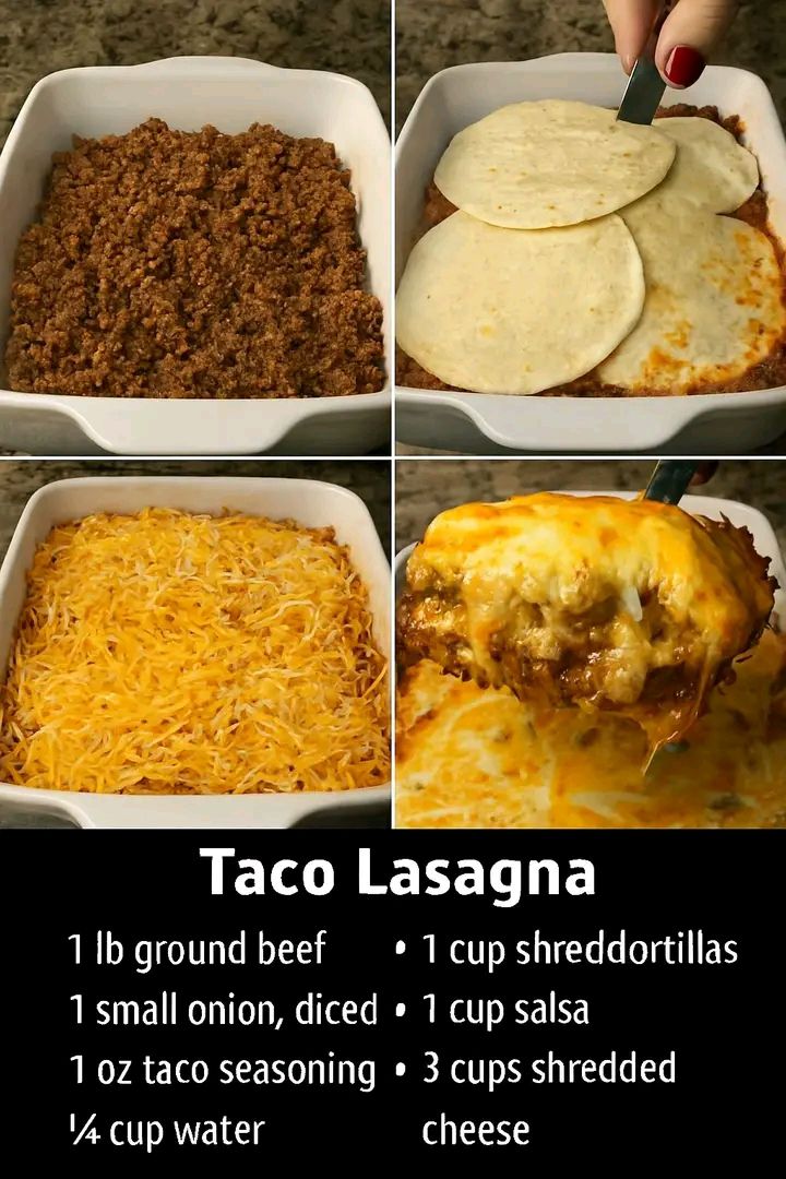 Ohhh yes 😋 — Taco Lasagna is the best of both worlds: all your favorite taco flavors layered like a cheesy, saucy lasagna! 🌮🧀 It’s hearty, fun to make, and perfect for family dinners or potlucks.Here’s the classic crowd-pleasing recipe 👇