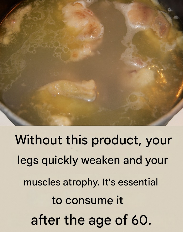 The image shows what looks like chicken or bone broth simmering, and the message emphasizes its importance after age 60 to prevent muscle weakening and atrophy, especially in the legs.